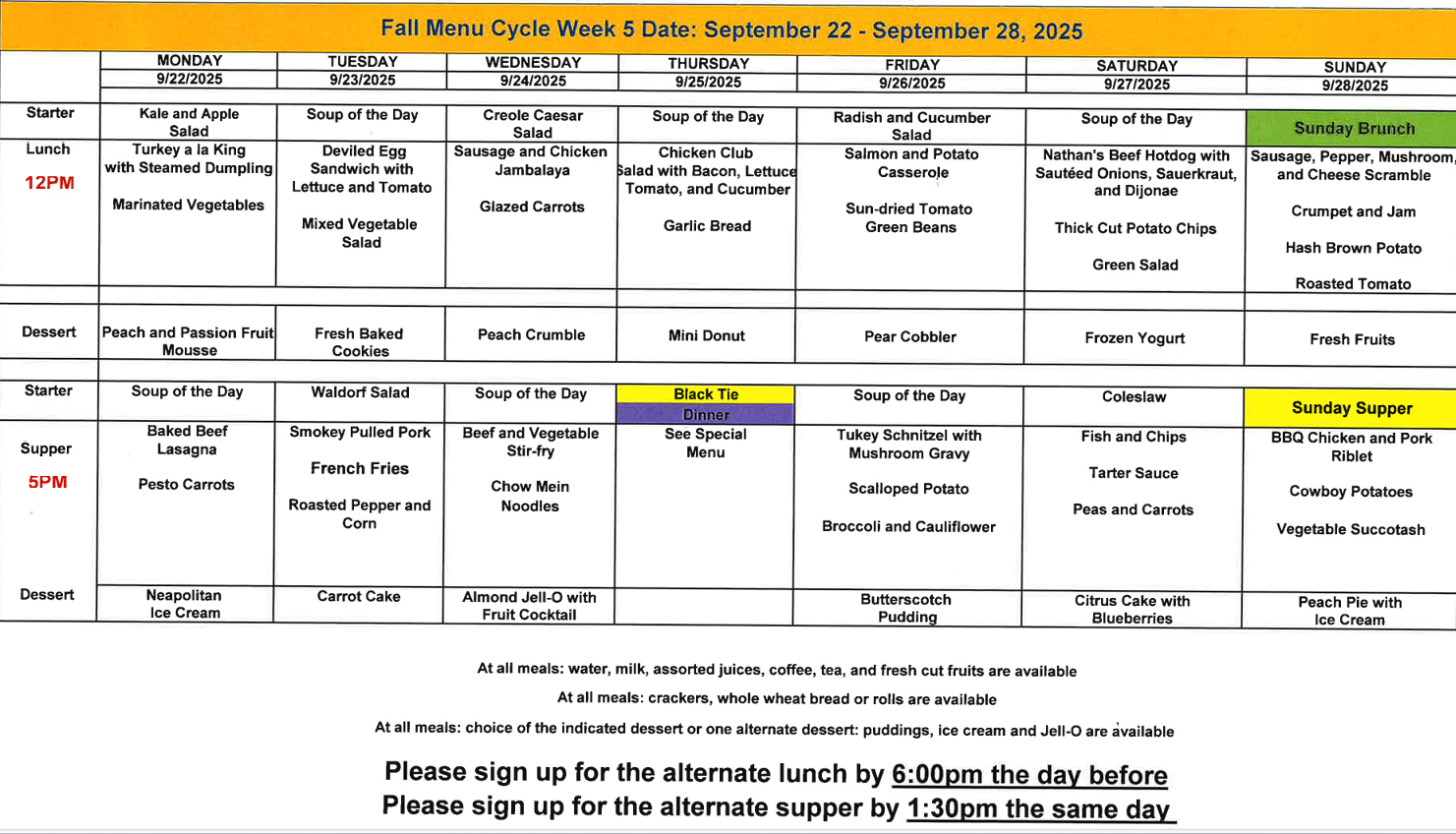 Our homecooked meals are on a five week menu rotation that change twice a year. All menus are collaborated with a nutritionist and our on-site chef.